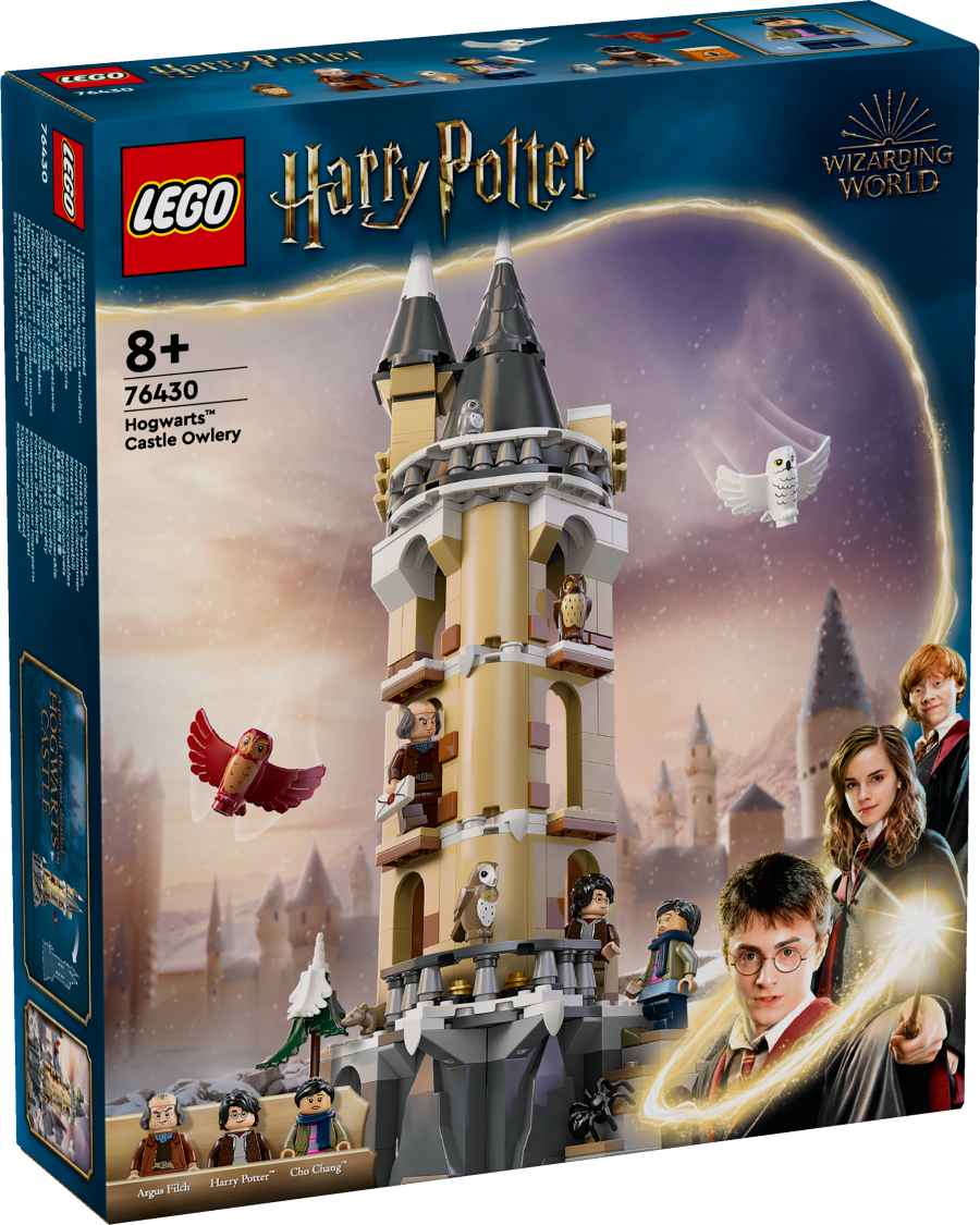 • Trzy postacie LEGO® Harry Potter™ — minifigurki LEGO Cho Chang™, Argusa Filcha i Harry’ego Pottera oraz pięć różnych figurek sów, w tym Świstoświnka